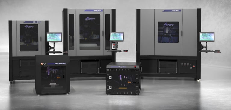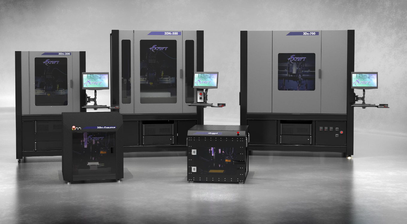 Il sistema di produzione digitale diretta configurabile dall'utente nScrypt può passare da CAD a un prodotto elettronico finito perfettamente funzionante con cambio utensile automatico, stampa 3D della struttura e dell'alloggiamento con la nostra testa dello strumento di estrusione del materiale nFD, microdispensazione conforme e inclusione di tracce conduttive nella struttura con il nostro strumento Smartpump™ testa (pentagramma fino a 10 um, linee stampate fino a 20 um e punti fino a 50 um (a seconda del materiale)), prelievo e posizionamento di componenti elettronici con la nostra testa utensile PNP e caratteristiche di micro-fresatura della superficie fine con la nostra testa utensile nMill . Questo sistema controlla e sincronizza più teste portautensili, che chiamiamo gizmos, in serie o in parallelo. Le opzioni includono sinterizzazione, letto riscaldato, polimerizzazione UV, integrazione laser, visione artificiale e scansione per Z-tracking e stampa conforme e visualizzazione del processo in tempo reale. La serie 3Dn FiT è conforme agli standard SMEMA per la produzione in linea, come nella nostra fabbrica in linea (FiL).